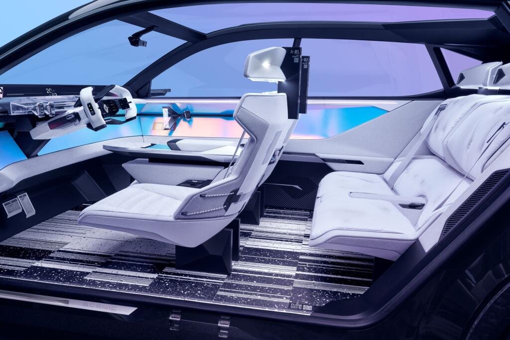 Zvnútra vyzerá oveľa veľkolepejšie, za čo môže aj nová definícia ambientného osvetlenia Renaultu. Okolo celého priestoru pre cestujúcich sa tiahne široký panel s futuristicky vyzerajúcimi farbami. Neustále sa menia a vnášajú tak do kabíny dynamiku. Volant by si tiež mohol zahrať v nejakom sci-fi filme. Pod čelným sklom je ďalšia obrazovka, ktorá sa tiahne takmer cez celú šírku vozidla a pomocou kamery zobrazuje celý priestor pred vozidlom. To by malo zväčšiť zorné pole o viac ako 24 percent. V prednom rade je nainštalovaných celkovo desať malých dotykových obrazoviek, ktoré vyzerajú ako inteligentné hodinky a slúžia na rôzne funkcie. Pomocou miniaplikácií pripevnených na vnútorných paneloch dverí je možné nastaviť napríklad polohu sedenia.