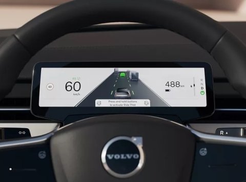Displej ukazuje dojazd 488 km pri takmer nabitej batérii. Možno nám chce Volvo takto poskytnúť predstavu o dojazde modelu EX90.